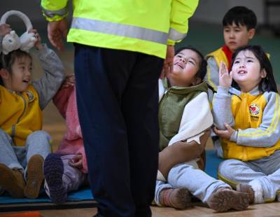 2022年9月10日是一年一度的教师节,也恰逢中国传统节日中秋节。我国多地师生以各种形式共同庆祝“双节”。图为2022年9月9日,在江苏省镇江市解放路幼儿园,一名小朋友将志愿者指导她制作的鲜花送给老师。 (石玉成 摄/光明图片)