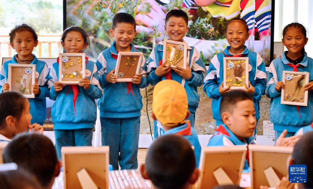 8月15日,拉鲁小学的学生在拉鲁湿地国家级自然保护区管理局科普小教室里向大家展示优秀植物标本。
