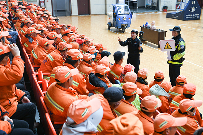 民警结合环卫工人作业早、路况复杂等实际情况,重点讲解遵守交通信号、拒绝逆行闯红灯、注意观察来车方向、佩戴安全头盔等关键事项,提升环卫工人安全防护与避险能力。