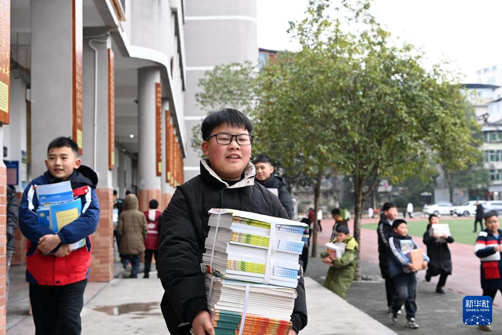 2月16日,在重庆市酉阳土家族苗族自治县实验小学,学生们在领取新学期课本。