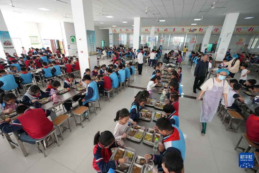 4月17日,在位于潍坊市寿光市羊口镇的寿光市羊口新区小学,学生在学校食堂吃午餐。