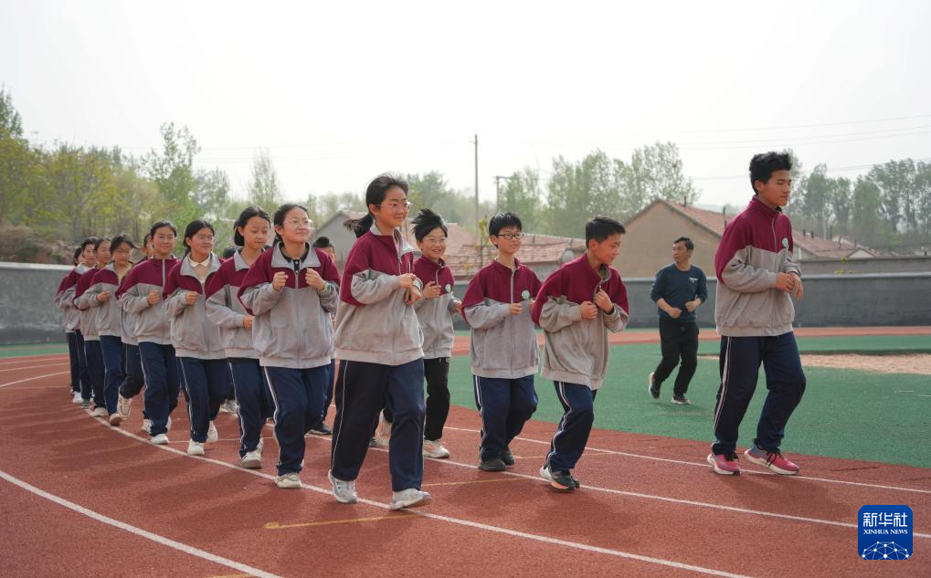 4月17日,在位于潍坊市临朐县石家河村的临朐县弥水教育集团石家河校区,学生在操场塑胶跑道上进行体育锻炼。