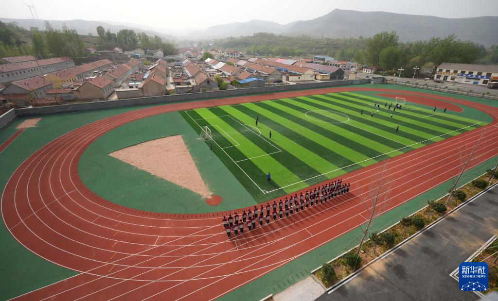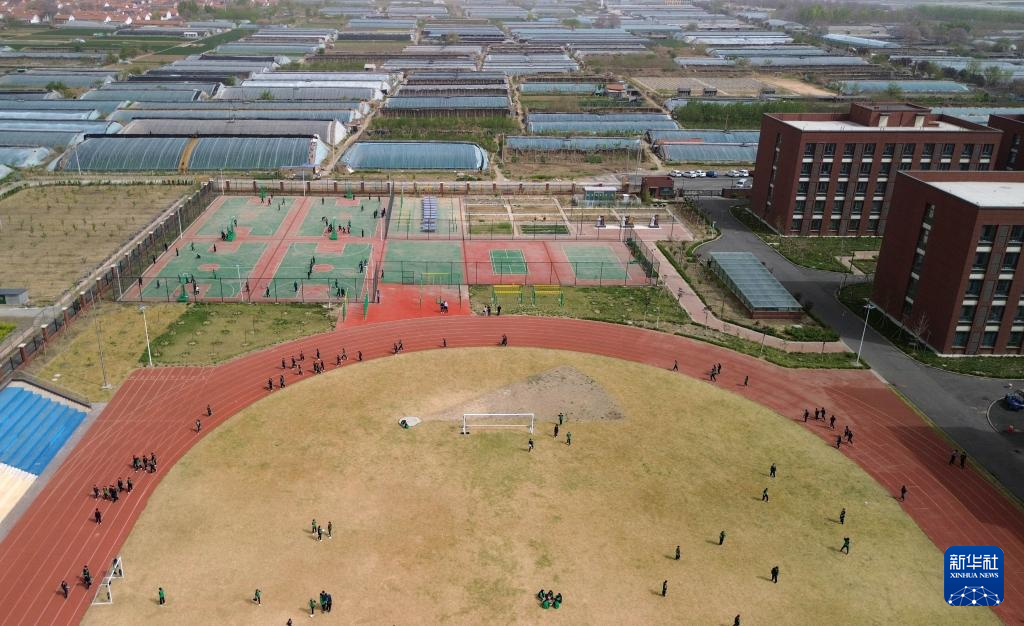 位于潍坊寿光市八里庄村的寿光市文圣学校(4月17日摄,无人机照片)。操场铺设了塑胶跑道。