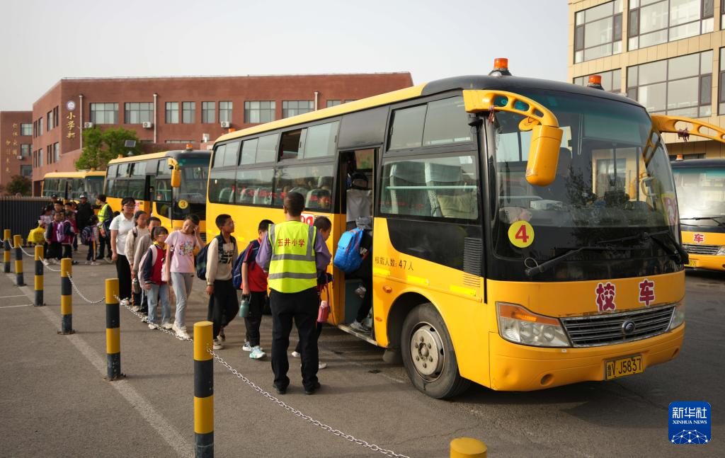 4月17日,在潍坊市临朐县五井镇五井小学,学生排队乘坐校车离校。