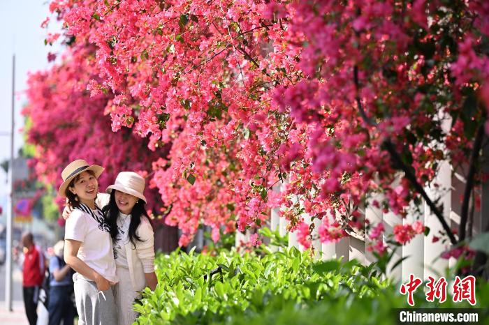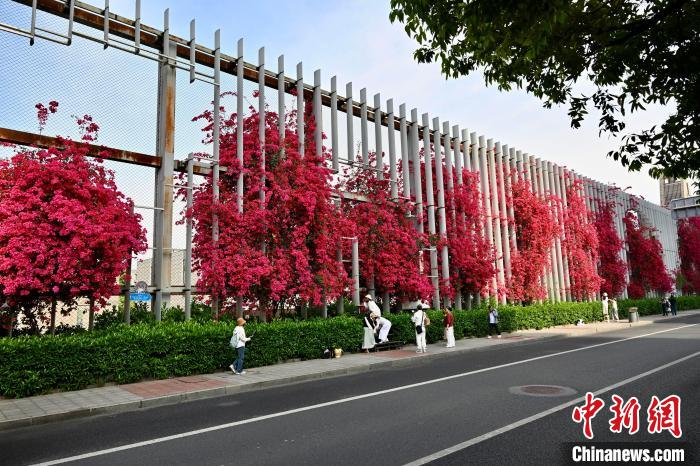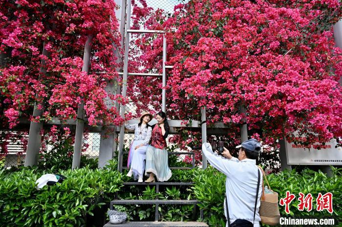 4月27日,四川成都一中学围墙被盛开的三角梅爬满,形成一道靓丽风景线,吸引不少市民前来打卡拍摄。中新社记者 张浪 摄