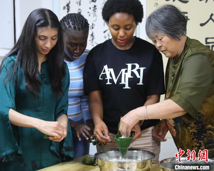 图为社区居民指导外国留学生包粽子。曹建雄 摄