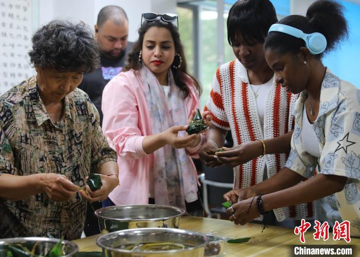5月27日,在河北省秦皇岛市海港区白塔岭街道燕大西苑社区,当地外国留学生相聚一堂,通过包粽子、体验木版年画等方式,沉浸式体验中华文化的魅力。图为社区居民指导外国留学生包粽子。曹建雄摄