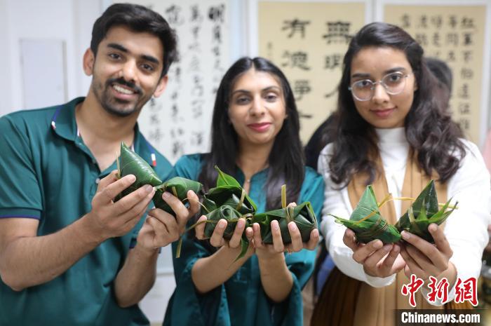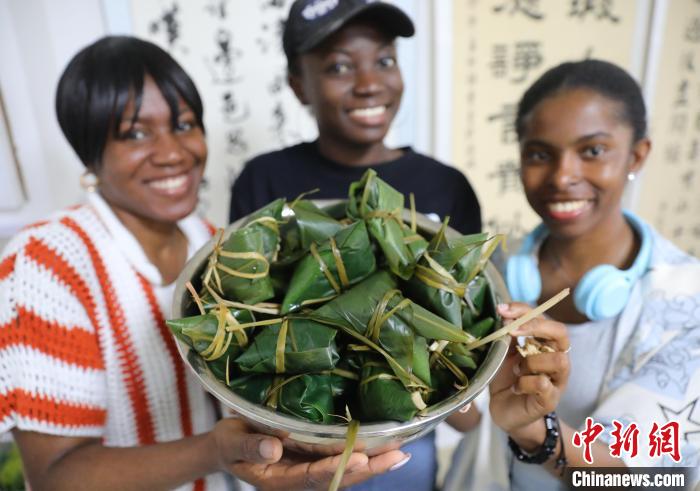 图为外国留学生展示包好的粽子。曹建雄 摄