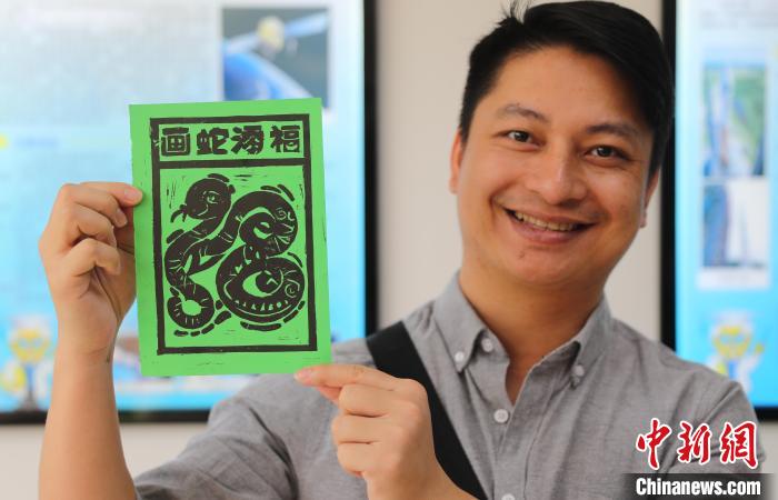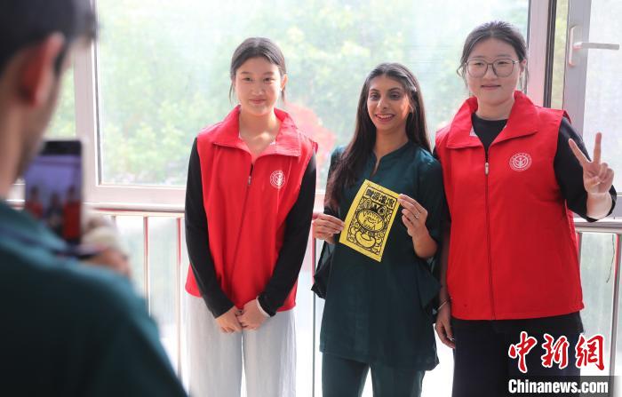 图为外国留学生持作品与志愿者合影留念。曹建雄 摄