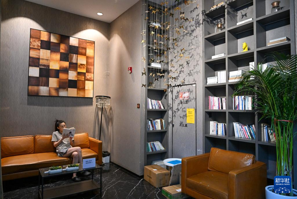 在天住领寓(棉三店),一名入住人才公寓的青年在公共休闲区读书(7月15日摄)。