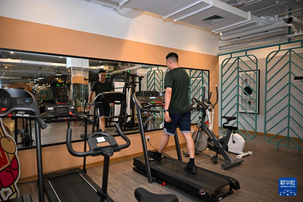 在泊寓(天津音乐学院店),一名入住人才公寓的青年在公共空间健身(7月15日摄)。