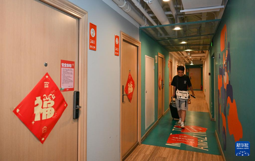 在泊寓(天津音乐学院店),一名办理完入住的青年准备走入房间(7月15日摄)。