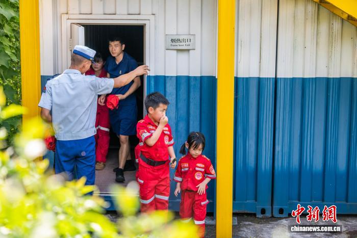 7月28日,在贵州省毕节市七星关区南环路消防救援站,孩子们正在体验穿越烟热训练。罗大富 摄