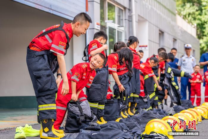 7月28日,在贵州省毕节市七星关区南环路消防救援站,孩子们正在体验穿戴灭火防护服。罗大富 摄