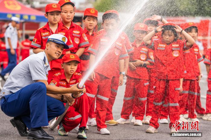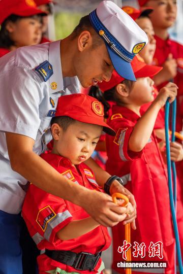 7月28日,在贵州省毕节市七星关区南环路消防救援站,孩子们正在体验消防水枪的使用。罗大富 摄