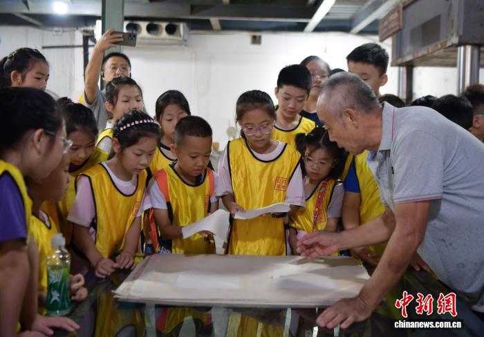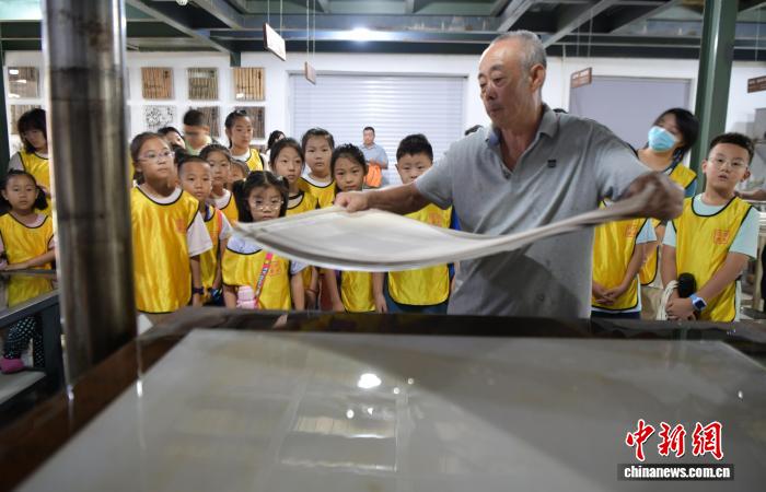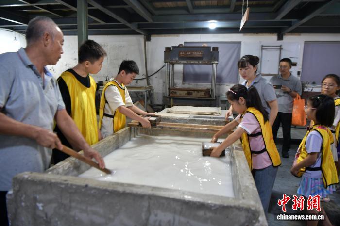 8月21日,河北省保定市竞秀区宝虹艺术博物馆,小朋友们正在体验传统造纸技艺。近年来,该区以“文化+旅游”打造非国有博物馆,截至2025年已备案10座,涵盖工艺、民俗等多领域,并通过“博物馆+研学”等创新模式,活化民间文化资源,激活文旅经济。中新社记者翟羽佳 摄