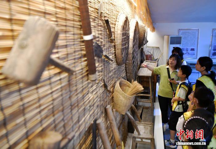 8月21日,河北省保定市竞秀区宝虹艺术博物馆,小朋友们参观传统造纸工具。近年来,该区以“文化+旅游”打造非国有博物馆,截至2025年已备案10座,涵盖工艺、民俗等多领域,并通过“博物馆+研学”等创新模式,活化民间文化资源,激活文旅经济。中新社记者翟羽佳 摄