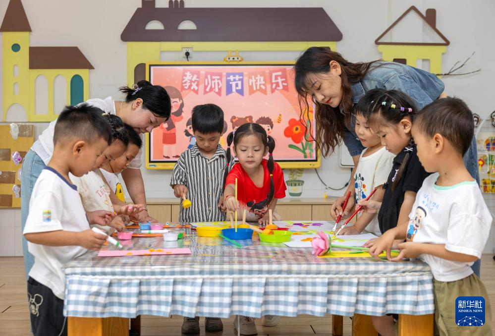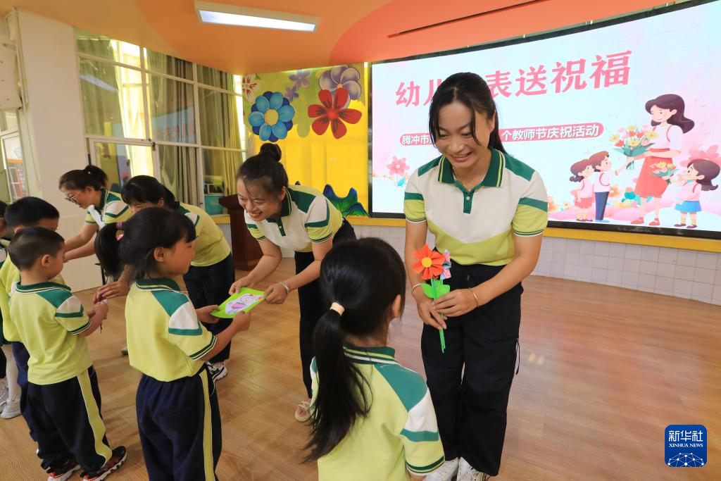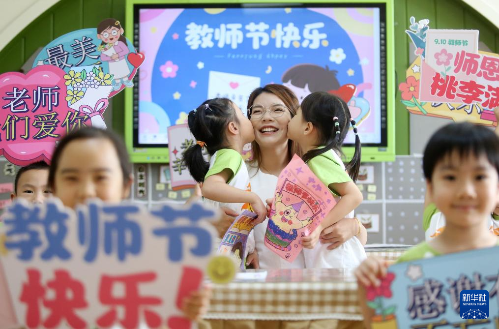 9月10日,在湖北省武汉市洪山区实验寄宿幼儿园,小朋友为老师送上节日祝福。