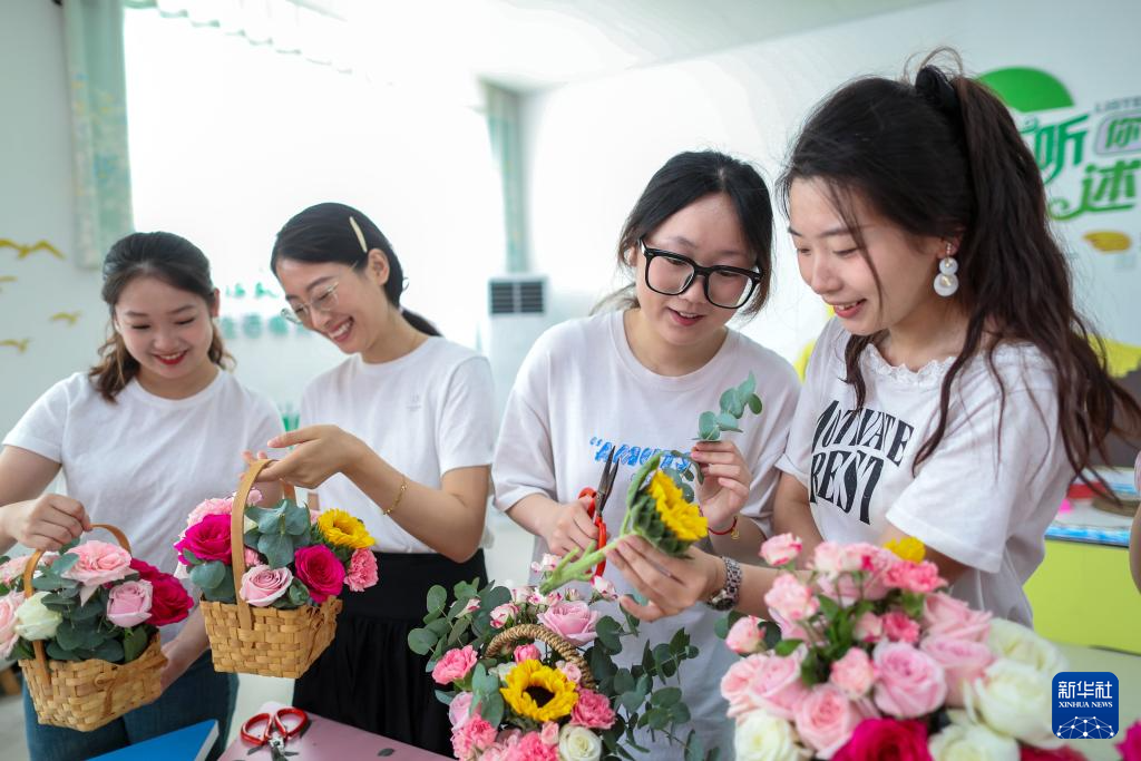9月10日,在江苏省泰州市姜堰区第四中学,老师们参加教师节主题插花活动。
