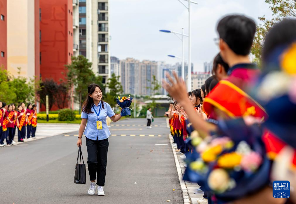 9月10日,学生在贵州省黔西第一中学列队欢迎到校教师。