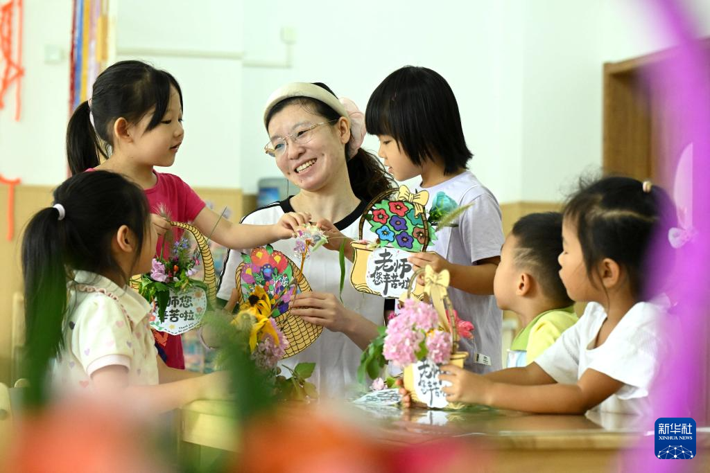 9月10日,在河北省石家庄市新华区华北幼儿园,孩子们为老师送上制作的花篮和祝福。