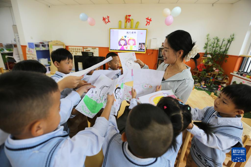 9月10日,在山东省临沂市沂南县双堠镇中心幼儿园,孩子们和老师一起庆祝教师节。