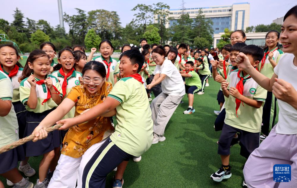 9月10日,在山东省枣庄市市中区建设路小学,老师和学生们一起参加拔河比赛。