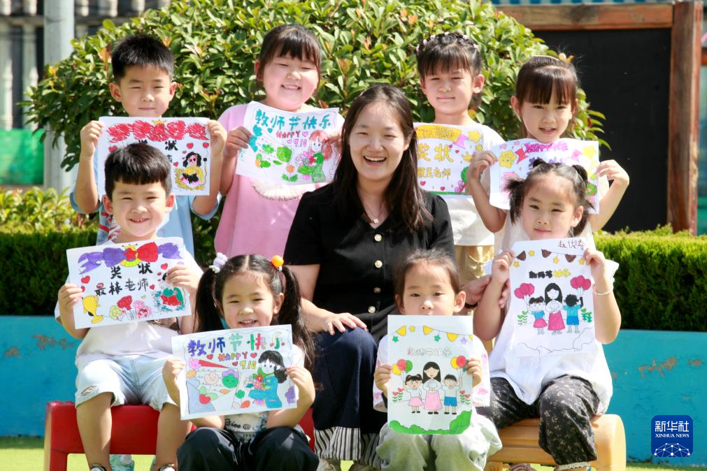 9月10日,在山东省临沂市平邑县铜石镇中心幼儿园,学生手持手工制作的教师节贺卡和老师合影留念。