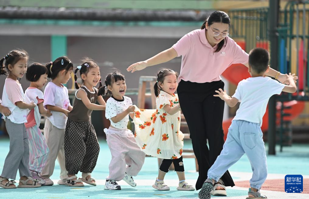9月10日,在山东省滕州市西岗镇中心幼儿园(柴里)分园,老师和小朋友一起玩“老鹰捉小鸡”趣味游戏。