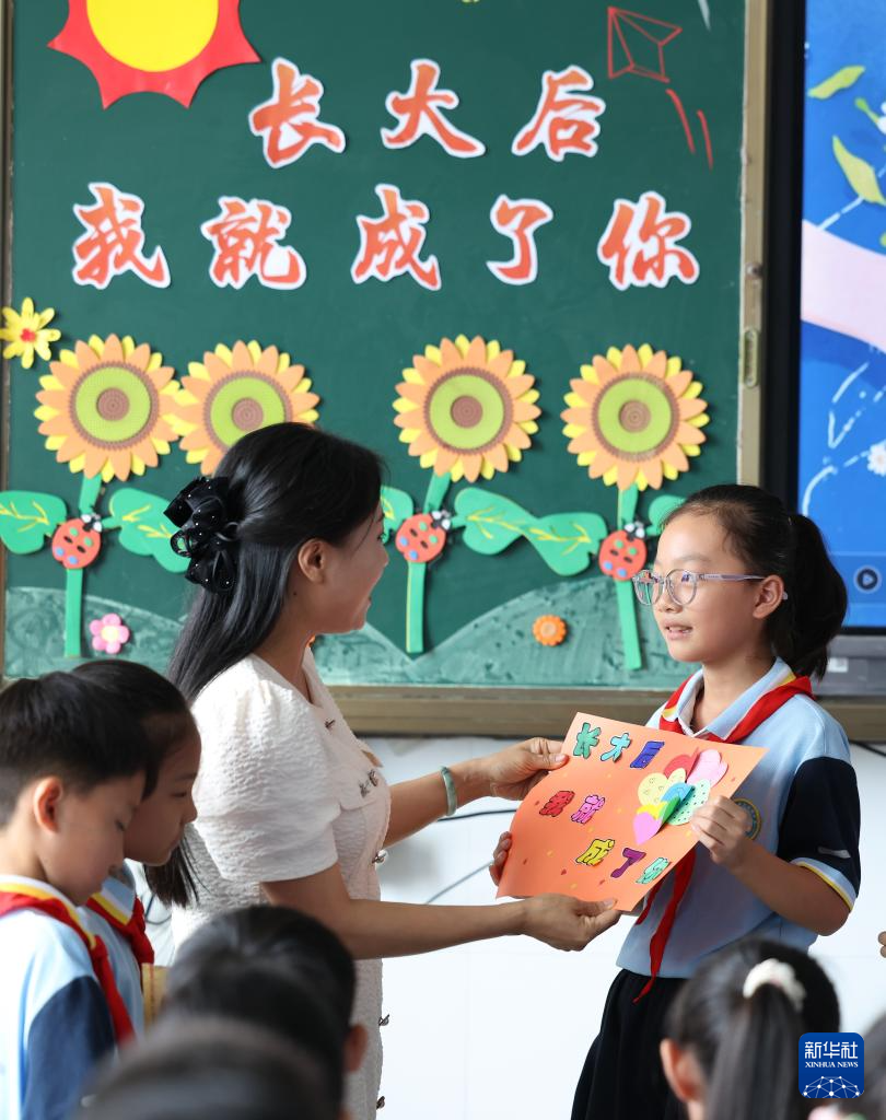 9月10日,河南省洛阳市汝阳县第二实验小学学生给老师送上手工制作的花表达节日祝福。
