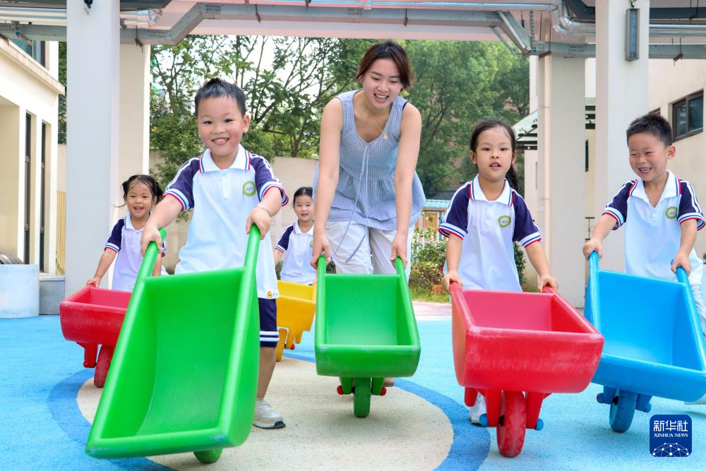 9月10日,在浙江省湖州市长兴县水木花都幼儿园举办的“我陪老师过节日”教师节主题活动中,孩子们与老师一起玩“推车赛跑”游戏。