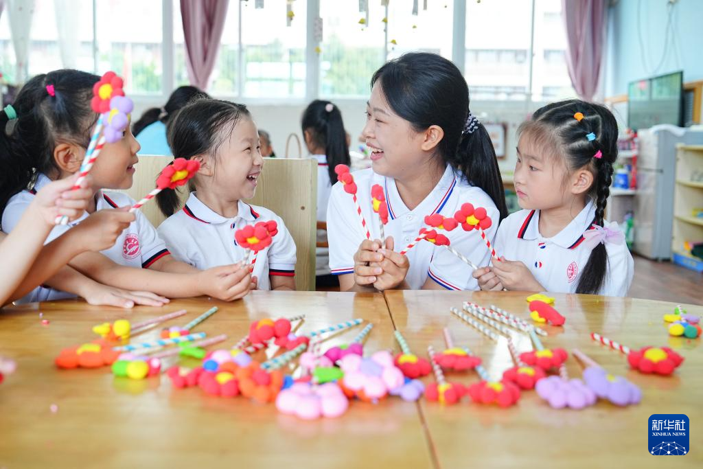 9月10日,小朋友在江苏省泰州市大冯中心幼儿园制作花朵,准备送给老师。