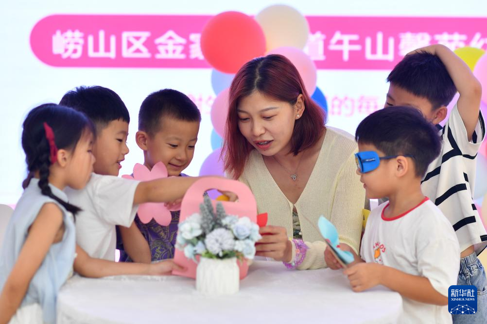 9月10日,在山东省青岛市崂山区金家岭街道午山馨苑幼儿园开展的教师节活动上,小朋友为老师献上自制的祝福贺卡。