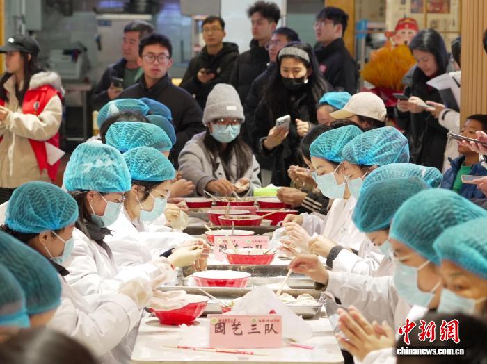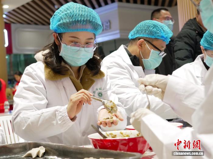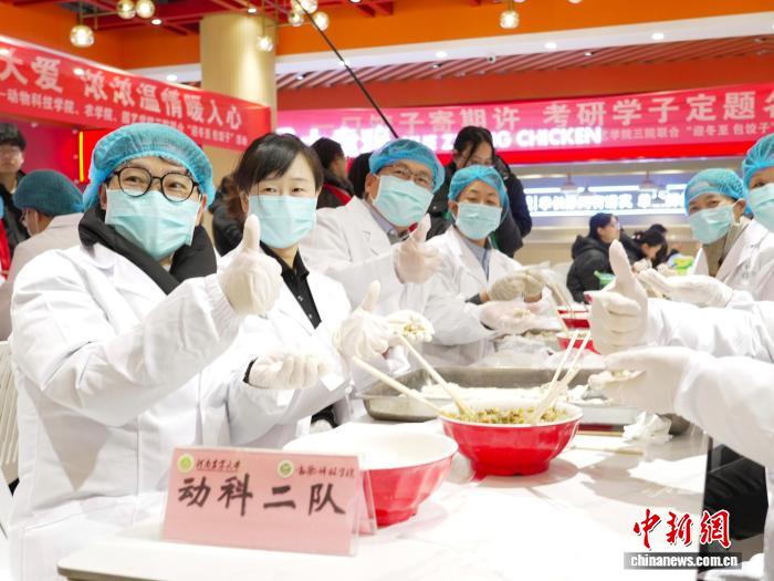 12月21日,河南农业大学龙子湖校区餐厅内,该校教师为学生包2000余份冬至饺子迎佳节。据悉,此次活动所用的猪肉、羊肉馅料,饺子皮小麦原料以及配菜,均来自学校各学院选育的优质品种。图为众多教师参与包饺子。中新社记者李超庆 摄