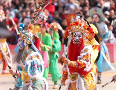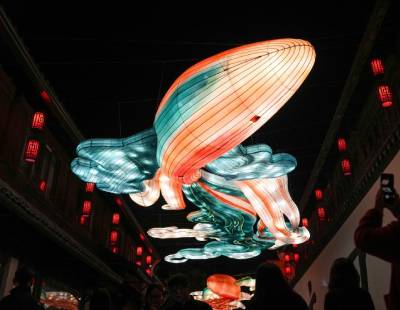 1月26日晚,甘肃省博物馆“马力全开”博物馆启航夜活动在兰州市举行。活动通过“主题晚会+夜探博物馆”的创新模式,让千年丝路文物与现代潮流激情碰撞,让文物在马年新春焕发新潮活力。图为以“铜奔马”为主题的绿马玩偶与机械狗同台演绎吸引嘉宾。中新社记者九美旦增 摄