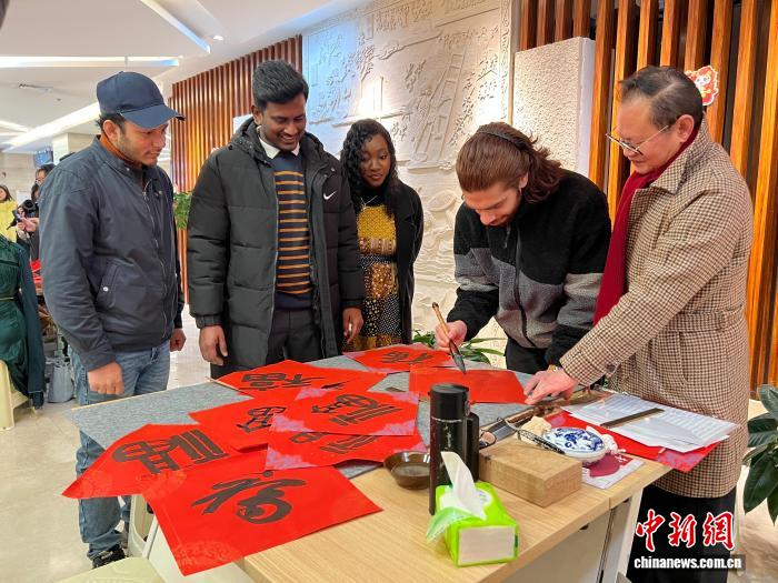 2月3日,新春佳节临近,年味渐浓。来自印度尼西亚、摩洛哥、孟加拉国等10余个国家的国际留学生走进重庆市巴南区,通过学唱山歌、写“福”字、打糍粑、磨豆花等方式,在传统文化与烟火香气中,感受中国新春的喜庆氛围,近距离感受独特年味。图为国际留学生学写“福”字。中新网记者钟旖 摄