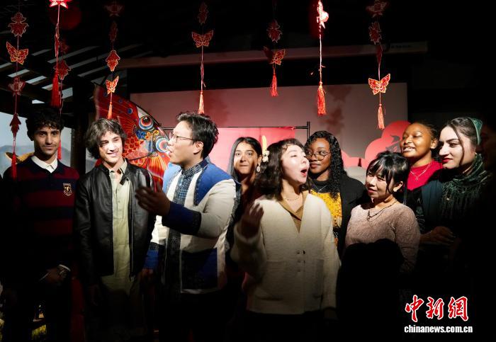 2月3日,新春佳节临近,年味渐浓。来自印度尼西亚、摩洛哥、孟加拉国等10余个国家的国际留学生走进重庆市巴南区,通过学唱山歌、写“福”字、打糍粑、磨豆花等方式,在传统文化与烟火香气中,感受中国新春的喜庆氛围,近距离感受独特年味。图为国际留学生们学习“木洞山歌”。中新网记者景诗雁 摄