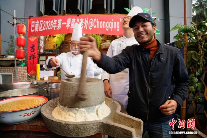 2月3日,新春佳节临近,年味渐浓。来自印度尼西亚、摩洛哥、孟加拉国等10余个国家的国际留学生走进重庆市巴南区,通过学唱山歌、写“福”字、打糍粑、磨豆花等方式,在传统文化与烟火香气中,感受中国新春的喜庆氛围,近距离感受独特年味。图为国际留学生体验磨豆花。中新网记者景诗雁 摄