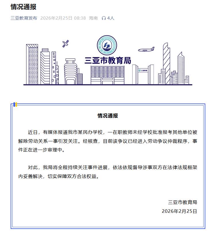 海南省三亚市教育局2月25日发布情况通报:近日,有媒体报道我市某民办学校,一在职教师未经学校批准报考其他单位被解除劳动关系一事引发关注。 经核查,目前该争议已经进入劳动争议仲裁程序,事件正在进一步审理中。对此,我局将全程持续关注事件进展,依法依规督导涉事双方在法律法规框架内妥善解决,切实保障双方合法权益。