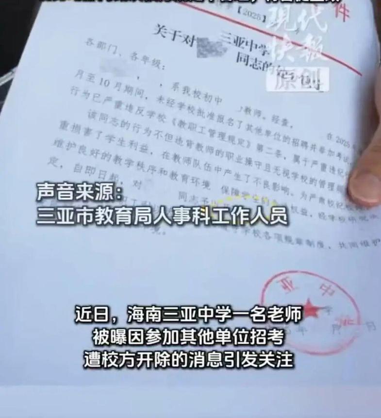 据媒体报道,相关材料显示,三亚中学于2025年决定开除一名在校老师,因为其“在2025年9月至10月期间,未经学校批准报名了其他单位的招聘并参加考试”。校方认为,该老师的行为违反学校《教职工管理规定》,属于严重违纪行为,决定予以开除处分。